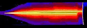 The Amalthea gossamer ring is a very faint structure with a rectangular cross section, stretching from the orbit of Amalthea at 182000 km (2.54 RJ) to about 129000 km (1.80 RJ).[2][9] Its inner boundary is not clearly defined because of the presence of the much brighter main ring and halo.[2] The thickness of the ring is approximately 2300 km near the orbit of Amalthea and slightly decreases in the direction of Jupiter.[lower-alpha 6][4] The Amalthea gossamer ring is actually the brightest near its top and bottom edges and becomes gradually brighter towards Jupiter; one of the edges is often brighter than another.[29] The outer boundary of the ring is relatively steep;[2] the ring's brightness drops abruptly just inward of the orbit of Amalthea,[2] although it may have a small extension beyond the orbit of the satellite ending near 4:3 resonance with Thebe.[14] In forward-scattered light the ring appears to be about 30 times fainter than the main ring.[2] In back-scattered light it has been detected only by the Keck telescope[4] and the ACS (Advanced Camera for Surveys) on HST.[12] Back-scattering images show additional structure in the ring: a peak in the brightness just inside the Amalthean orbit and confined to the top or bottom edge of the ring.[4][14]