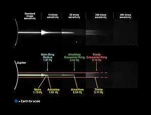 In back-scattered light[lower-alpha 3] the situation is different. The outer boundary of the main ring, located at 129,100 km, or slightly beyond the orbit of Adrastea, is very steep.[9] The orbit of the moon is marked by a gap in the ring so there is a thin ringlet just outside its orbit. There is another ringlet just inside Adrastean orbit followed by a gap of unknown origin located at about 128,500 km.[9] The third ringlet is found inward of the central gap, outside the orbit of Metis. The ring's brightness drops sharply just outward of the Metidian orbit, forming the Metis notch.[9] Inward of the orbit of Metis, the brightness of the ring rises much less than in forward-scattered light.[4] So in the back-scattered geometry the main ring appears to consist of two different parts: a narrow outer part extending from 128,000 to 129,000 km, which itself includes three narrow ringlets separated by notches, and a fainter inner part from 122,500 to 128,000 km, which lacks any visible structure like in the forward-scattering geometry.[9][12] The Metis notch serves as their boundary. The fine structure of the main ring was discovered in data from the Galileo orbiter and is clearly visible in back-scattered images obtained from New Horizons in February–March 2007.[7][13] The early observations by Hubble Space Telescope (HST),[3] Keck[4] and the Cassini spacecraft failed to detect it, probably due to insufficient spatial resolution.[8] However the fine structure was observed by the Keck telescope using adaptive optics in 2002–2003.[14]