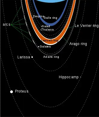 Neptune possesses five distinct rings[5] named, in order of increasing distance from the planet, Galle, Le Verrier, Lassell, Arago and Adams.[4] In addition to these well-defined rings, Neptune may also possess an extremely faint sheet of material stretching inward from the Le Verrier to the Galle ring, and possibly farther in toward the planet.[5][7] Three of the Neptunian rings are narrow, with widths of about 100 km or less;[6] in contrast, the Galle and Lassell rings are broad—their widths are between 2,000 and 5,000 km.[5] The Adams ring consists of five bright arcs embedded in a fainter continuous ring.[5] Proceeding counterclockwise, the arcs are: Fraternité, Égalité 1 and 2, Liberté, and Courage.[7][14] The first four names come from "liberty, equality, fraternity", the motto of the French Revolution and Republic. The terminology was suggested by their original discoverers, who had found them during stellar occultations in 1984 and 1985.[8] Four small Neptunian moons have orbits inside the ring system: Naiad and Thalassa orbit in the gap between the Galle and Le Verrier rings; Despina is just inward of the Le Verrier ring; and Galatea lies slightly inward of the Adams ring,[4] embedded in an unnamed faint, narrow ringlet.[7]