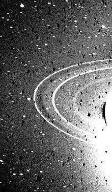 The rings were investigated in detail during the Voyager 2 spacecraft's flyby of Neptune in August 1989.[5] They were studied with optical imaging, and through observations of occultations in ultraviolet and visible light.[6] The spaceprobe observed the rings in different geometries relative to the Sun, producing images of back-scattered, forward-scattered and side-scattered light.[lower-alpha 6][5] Analysis of these images allowed derivation of the phase function (dependence of the ring's reflectivity on the angle between the observer and Sun), and geometrical and Bond albedo of ring particles.[5] Analysis of Voyager's images also led to discovery of six inner moons of Neptune, including the Adams ring shepherd Galatea.[5]