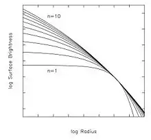 where is the intensity at . The parameter , called the "Sérsic index," controls the degree of curvature of the profile (see figure). The smaller the value of , the less centrally concentrated the profile is and the shallower (steeper) the logarithmic slope at small (large) radii is. The equation for describing this is: