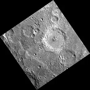 Sūr Dās and Riemenschneider craters, from MESSENGER's first flyby in January 2008