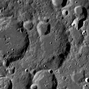 Schlesinger is a lunar impact crater on the far side of the Moon. The crater Esnault-Pelterie overlies the western part of the rim and the outer rampart of that crater has covered about half the interior floor, leaving a crescent-shaped feature. To the south-southwest of Schlesinger is the crater Von Zeipel and to the southeast lies Quetelet.