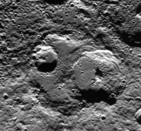 Two smaller, unnamed craters overlie Scopas crater itself. The northern rims of these craters are in permanent shadow.[3]
