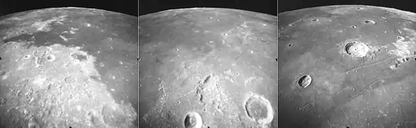 These are three views of Mare Tranquillitatis on the Moon, taken by the mapping camera of the Apollo 17 mission in 1972, facing south-southwest from an average altitude of 111 km on Revolution 36 of the mission. At the left is the east side of Mare Tranquillitatis, with the craters Franz (bottom right), Lyell (dark floor, right of center), and Taruntius (upper left). The "bay" of dark mare (basalt) at left is Sinus Concordiae, with "islands" of older, light highland material. At the right is the crater Cauchy, which lies between the Rupes Cauchy and Cauchy rille. The center photo shows the central mare with craters Vitruvius (lower right) and Gardner (bottom center). At the horizon are lighter highlands at the southern margin of the mare, near the Apollo 11 landing site. The crater Jansen is visible at the edges of both the center and right photos. The right photo shows the western mare, with the craters Dawes (lower left) and the large Plinius (43 km diameter), with the Plinius Rilles in the foreground. These photos were taken within minutes of each other as the command module America orbited the Moon. The Sun elevation drops from 46 degrees at left to 30 degrees at right.