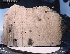 A Martian meteorite is a rock that formed on Mars, was ejected from the planet by an impact event, and traversed interplanetary space before landing on Earth as a meteorite. As of September 2020, 277 meteorites had been classified as Martian, less than half a percent of the 72,000 meteorites that have been classified.[1] The largest complete, uncut Martian meteorite, Taoudenni 002,[3] was recovered in Mali in early 2021. It weighs 14.5 kilograms (32 pounds) and is on display at the Maine Mineral and Gem Museum.