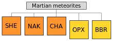 There are three groups of Martian meteorite: shergottites, nakhlites and chassignites, collectively known as SNC meteorites. Several other Martian meteorites are ungrouped. These meteorites are interpreted as Martian because they have elemental and isotopic compositions that are similar to rocks and atmospheric gases on Mars, which have been measured by orbiting spacecraft, surface landers and rovers.[4][5] The term does not include meteorites found on Mars, such as Heat Shield Rock.