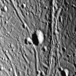 Shirin is an impact crater located on the anti-Saturn hemisphere of Saturn's moon Enceladus. Shirin was first observed in Cassini images during that mission's March 2005 flyby of Enceladus. It is located at 1.9° South Latitude, 172.4° West Longitude, and is 8.7 kilometers across.[1] Cassini observed several, narrow, southwest–northeast trending fractures cutting across Shirin, forming canyons up to a hundred metres deep along the crater's rim. Several wider fractures are seen nearby, however these appeared to form before the Shirin impact since the crater appears to cover these fractures as they appear it.