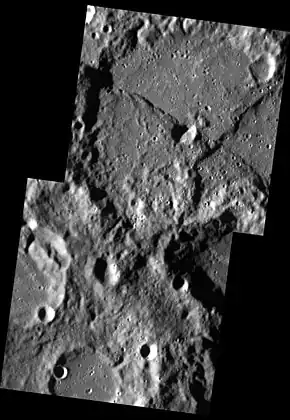 Simonides has a small, somewhat irregular pit in its center. Unnamed wrinkle ridges cross the floor of the crater, and one extends to the northwest and southeast.