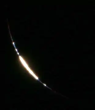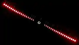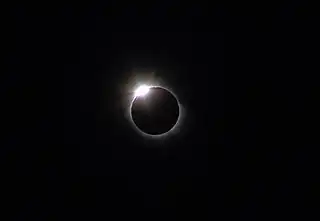 - Second contact—starting with Baily's Beads (caused by light shining through valleys on the Moon's surface) and the diamond ring effect. Almost the entire disk is covered.
