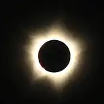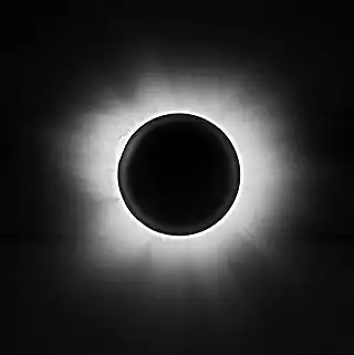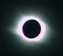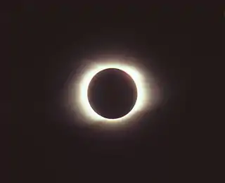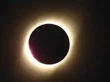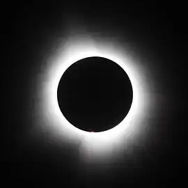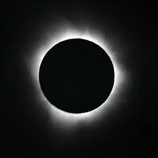 ![]() A total solar eclipse occurs when the Moon completely covers the Sun's disk, as seen in this solar eclipse. Solar prominences can be seen along the limb (in red) as well as extensively the coronal and partly the radiating coronal streamers. | |