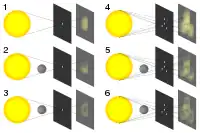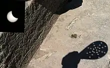 The safest way to view the Sun's disk is by indirect projection.[56] This can be done by projecting an image of the disk onto a white piece of paper or card using a pair of binoculars (with one of the lenses covered), a telescope, or another piece of cardboard with a small hole in it (about 1 mm diameter), often called a pinhole camera. The projected image of the Sun can then be safely viewed; this technique can be used to observe sunspots, as well as eclipses. Care must be taken, however, to ensure that no one looks through the projector (telescope, pinhole, etc.) directly.[57] A kitchen colander with small holes can also be used to project multiple images of the partially eclipsed Sun onto the ground or a viewing screen. Viewing the Sun's disk on a video display screen (provided by a video camera or digital camera) is safe, although the camera itself may be damaged by direct exposure to the Sun. The optical viewfinders provided with some video and digital cameras are not safe. Securely mounting #14 welder's glass in front of the lens and viewfinder protects the equipment and makes viewing possible.[55] Professional workmanship is essential because of the dire consequences any gaps or detaching mountings will have. In the partial eclipse path, one will not be able to see the corona or nearly complete darkening of the sky. However, depending on how much of the Sun's disk is obscured, some darkening may be noticeable. If three-quarters or more of the Sun is obscured, then an effect can be observed by which the daylight appears to be dim, as if the sky were overcast, yet objects still cast sharp shadows.[58]