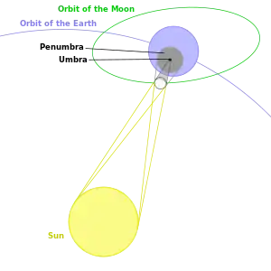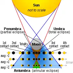 The diagrams to the right show the alignment of the Sun, Moon, and Earth during a solar eclipse. The dark gray region between the Moon and Earth is the umbra, where the Sun is completely obscured by the Moon. The small area where the umbra touches Earth's surface is where a total eclipse can be seen. The larger light gray area is the penumbra, in which a partial eclipse can be seen. An observer in the antumbra, the area of shadow beyond the umbra, will see an annular eclipse.[20]
