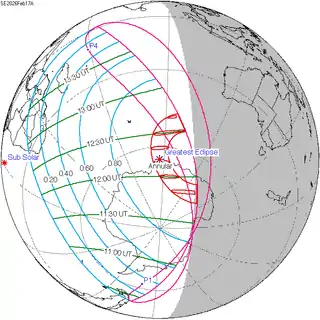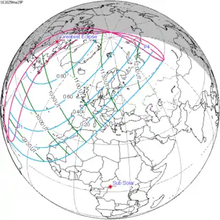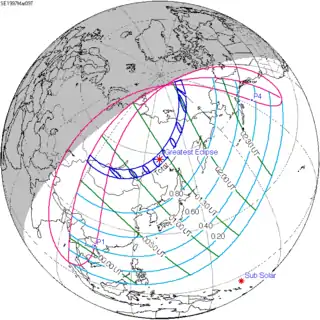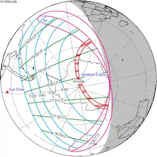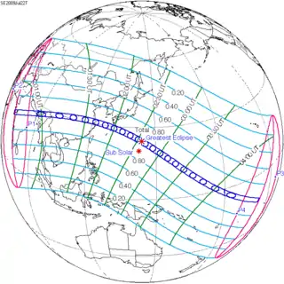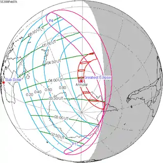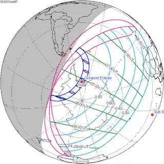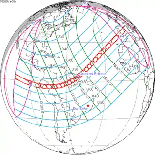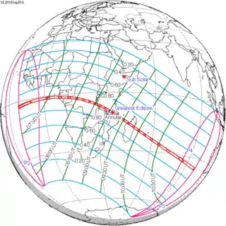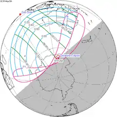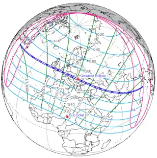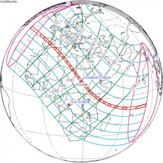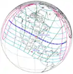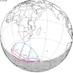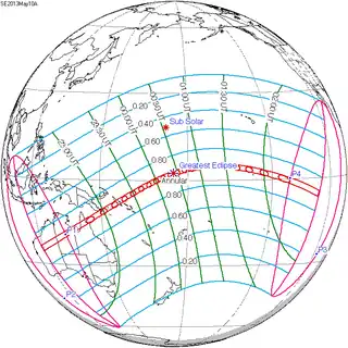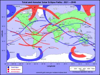 Central eclipse is often used as a generic term for a total, annular, or hybrid eclipse.[17] This is, however, not completely correct: the definition of a central eclipse is an eclipse during which the central line of the umbra touches Earth's surface. It is possible, though extremely rare, that part of the umbra intersects with Earth (thus creating an annular or total eclipse), but not its central line. This is then called a non-central total or annular eclipse.[17] Gamma is a measure of how centrally the shadow strikes. The last (umbral yet) non-central solar eclipse was on April 29, 2014. This was an annular eclipse. The next non-central total solar eclipse will be on April 9, 2043.[18]