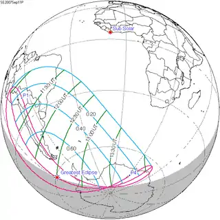 The longest eclipse that has been calculated thus far is the eclipse of July 16, 2186 (with a maximum duration of 7 minutes 29 seconds over northern Guyana).[35]