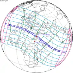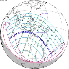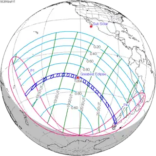 - The vector of the eclipse path at the midpoint of the eclipse aligning with the vector of Earth's rotation (i.e. not diagonal but due east).