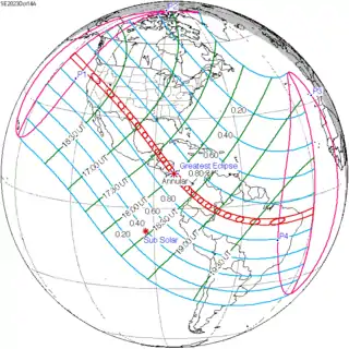 ![]() An annular solar eclipse occurs when the Moon is too far away to completely cover the Sun's disk (October 14, 2023). | |