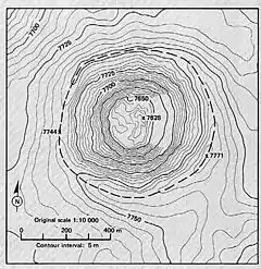 Topographic map of South Ray based on processing of Apollo 16 panoramic camera images. The dashed line indicates the crater rim.