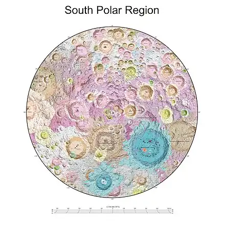 The lunar south pole is the southernmost point on the Moon. It is of interest to scientists because of the occurrence of water ice in permanently shadowed areas around it. The lunar south pole region features craters that are unique in that the near-constant sunlight does not reach their interior. Such craters are cold traps that contain fossil records of hydrogen, water ice, and other volatiles dating from the early Solar System.[1][2] In contrast, the lunar north pole region exhibits a much lower quantity of similarly sheltered craters.[3]