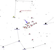 In 1969 Williams solved this lost Messier object by measuring its right ascension and declination relative to those of the nearby galaxy M89 (notable reference stars angularly nearby are sparse) rather than M58, a 9th-magnitude galaxy which Messier recorded in 1778. This amended night sky "star-hopping" reference point matches Messier's figures[4] to 0.1 of an arcminute () in right ascension and 1 in declination, a sixtieth of a degree.
