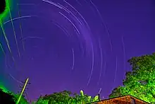 Star trail photographs are possible because of the rotation of Earth about its axis. The apparent motion of the stars is recorded as mostly curved streaks on the film or detector.[5] For observers in the Northern Hemisphere, aiming the camera northward creates an image with concentric circular arcs centered on the north celestial pole (very near Polaris).[6] For those in the Southern Hemisphere, this same effect is achieved by aiming the camera southward. In this case, the arc streaks are centered on the south celestial pole (near Sigma Octantis). Aiming the camera eastward or westward shows straight streaks on the celestial equator, which is tilted at angle with respect to the horizon. The angular measure of this tilt depends on the photographer's latitude[5] (L), and is equal to 90° − L.