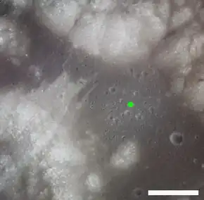 ![]() Location of Steno-Apollo crater in Taurus-Littrow Valley. South Massif is at lower left, North Massif is at top center, and Sculptured Hills are at upper right. Scale bar is 5 km | |