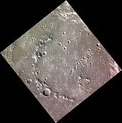 To the southwest is the large Shakespeare crater and further to the west is Janáček crater and Suisei Planitia.