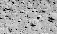 This crater formation has been heavily damaged by a history of impacts, leaving an irregular, battered outer rim. A smaller impact crater has merged into the southern rim; the northern rim is little more than an irregular, arcing range of ridges. The interior is nearly as irregular, and the entire formation is little more than a rugged depression in the surface.