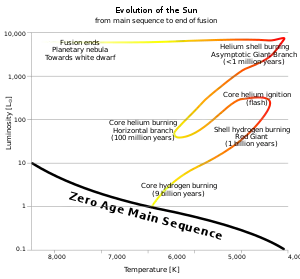 Every second, the Sun's core fuses about 600 billion kilograms (kg) of hydrogen into helium and converts 4 billion kg of matter into energy. Far in the future, when hydrogen fusion in the Sun's core diminishes to the point where the Sun is no longer in hydrostatic equilibrium, its core will undergo a marked increase in density and temperature which will cause its outer layers to expand, eventually transforming the Sun into a red giant. This process will make the Sun large enough to render Earth uninhabitable approximately five billion years from the present. Subsequently, the Sun will shed its outer layers and become a dense type of cooling star (a white dwarf), and no longer produce energy by fusion, but it will still glow and give off heat from its previous fusion for trillions of years. After that, it is theorized to become a super dense black dwarf, giving off no more energy.