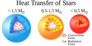 Since the Sun formed, the main fusion process has involved fusing hydrogen into helium. Over the past 4.6 billion years, the amount of helium and its location within the Sun has gradually changed. The proportion of helium within the core has increased from about 24% to about 60% due to fusion, and some of the helium and heavy elements have settled from the photosphere toward the center of the Sun because of gravity. The proportions of heavier elements are unchanged. Heat is transferred outward from the Sun's core by radiation rather than by convection (see Radiative zone below), so the fusion products are not lifted outward by heat; they remain in the core,[59] and gradually an inner core of helium has begun to form that cannot be fused because presently the Sun's core is not hot or dense enough to fuse helium. In the current photosphere, the helium fraction is reduced, and the metallicity is only 84% of what it was in the protostellar phase (before nuclear fusion in the core started). In the future, helium will continue to accumulate in the core, and in about 5 billion years this gradual build-up will eventually cause the Sun to exit the main sequence and become a red giant.[60]
