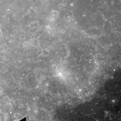A 2-km diameter crater in southern Tacchini crater has a bright ray system in this Apollo 10 image