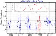 Beta Gruis is a semiregular variable (SRb) star that varies in magnitude by about 0.4. It varies between intervals when it displays regular changes with a 37-day periodicity and times when it undergoes slow irregular variability.[3]