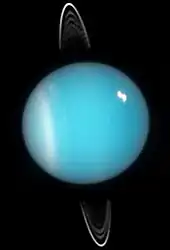 ![]() Uranus in true colour,[lower-alpha 1] as captured by Voyager 2. Uranus's pale, muted appearance is due to a shroud of haze above its clouds | |||||||||||||