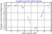 HR 2554, also known as V415 Carinae and A Carinae, is an eclipsing spectroscopic binary of the Algol type in the constellation of Carina whose apparent visual magnitude varies by 0.06 magnitude and is approximately 4.39 at maximum brightness. Its primary is a G-type bright giant star and its secondary is an A-type main-sequence star. It is approximately 553 light-years from Earth.