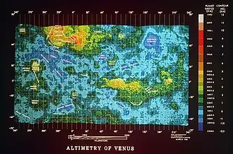 The longitude of physical features on Venus is expressed relative to its prime meridian. The original prime meridian passed through the radar-bright spot at the centre of the oval feature Eve, located south of Alpha Regio.[105] After the Venera missions were completed, the prime meridian was redefined to pass through the central peak in the crater Ariadne on Sedna Planitia.[106][107]