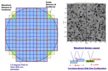 The camera focal plane is flat and 64 cm in diameter. The main imaging is performed by a mosaic of 189 CCD detectors, each with 16 megapixels.[46] They are grouped into a 5×5 grid of "rafts", where the central 21 rafts contain 3×3 imaging sensors, while the four corner rafts contain only three CCDs each, for guiding and focus control. The CCDs provide better than 0.2 arcsecond sampling, and will be cooled to approximately −100 °C (173 K) to help reduce noise.[47]