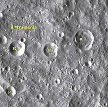 By convention these features are identified on lunar maps by placing the letter on the side of the crater midpoint that is closest to Vetchinkin.