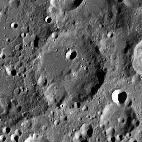 This is an eroded crater formation, particularly along the western and southwestern sides. The remaining rim is worn and rounded from smaller impacts, although the perimeter can still be clearly discerned. There is a small, worn crater laid across the south-southwestern rim and a cup-shaped crater located prominently in the northern half of the interior floor.