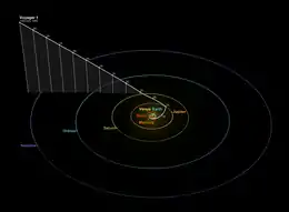 ![]() Voyager 1's trajectory seen from Earth, diverging from the ecliptic in 1981 at Saturn and now heading towards the constellation Ophiuchus |