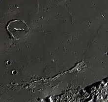 Wallace is the remains of a lunar impact crater that has been flooded by lava. It was named after British natural historian Alfred Russel Wallace.[1] It lies in the southeastern part of Mare Imbrium, to the northeast of the crater Eratosthenes. The crater rim forms a somewhat polygonal outline, and is broken in the southeast. The floor is flat and devoid of significant features, but it is overlain by ray material from Copernicus to the southwest. The rim ascends to an altitude of 0.4 km above the lunar mare.