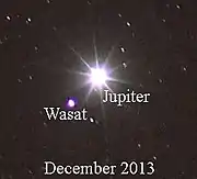 It bore the traditional name Wasat, which derives from the Arabic word for "middle".[11][12] In 2016, the International Astronomical Union organized a Working Group on Star Names (WGSN)[13] to catalogue and standardize proper names for stars. The WGSN approved the name Wasat for this star on 21 August 2016 and it is now so entered in the IAU Catalog of Star Names.[10]