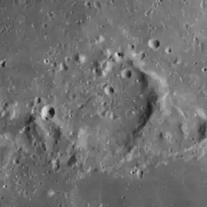Little remains of the original crater, besides a low curving ridge. The rim has been nearly destroyed along the northwest face, leaving only a few ridges in the surface. The remainder forms an irregular horseshoe, with the western part attached to a series of ridges leading to the west. The interior floor has been resurfaced by basaltic lava, forming a flat, nearly featureless surface that is marked only by a pair of tiny craters near the northeast rim.