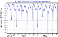 South African Astronomer A.W.J. Cousins noted ζ Cha to vary between magnitudes 5.06 and 5.17 in 1960.[13] It was classified as a Beta Cephei variable in the Hipparcos and Tycho Catalogues (ESA 1997), with a period of 1.07 days,[14] before being reclassified as a slowly pulsating B star in the 2011 version.[15] It is now known to be an eclipsing binary star, with a period of 2.7 days,[4] with continuous variation through the whole cycle due to the ellipsoidal shape of the component stars.[5]