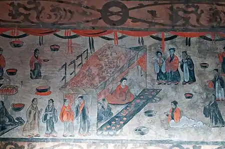 Ancient Chinese texts describe the mechanical carriage's functions; after one li was traversed, a mechanically driven wooden figure struck a drum, and after ten li had been covered, another wooden figure struck a gong or a bell with its mechanically operated arm.[116] However, there is evidence to suggest that the invention of the odometer was a gradual process in Han dynasty China that centered on the "huang men"—court people (i.e. eunuchs, palace officials, attendants and familiars, actors, acrobats, etc.) who followed the musical procession of the royal "drum-chariot".[117] There is speculation that at some time during the 1st century BC the beating of drums and gongs was mechanically driven by the rotation of the road wheels.[117] This might have actually been the design of Luoxia Hong (c. 110 BC), yet by at least 125 the mechanical odometer carriage was already known, as it was depicted in a mural of the Xiao Tang Shan Tomb.[117]