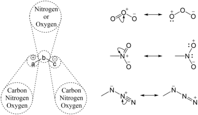 The dipole has at least one resonance structure with positive and negative charges having a 1,3 relationship which can generally be denoted as +a−b−c−, where a may be a carbon, oxygen or nitrogen, b may be nitrogen or oxygen, and c may be a carbon, oxygen or nitrogen.[3]