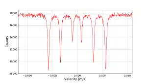 A wide variety of absorption band and line shapes exist, and the analysis of the band or line shape can be used to determine information about the system that causes it. In many cases it is convenient to assume that a narrow spectral line is a Lorentzian or Gaussian, depending respectively on the decay mechanism or temperature effects like Doppler broadening.[3] Analysis of the spectral density and the intensities, width and shape of spectral lines sometimes can yield a lot of information about the observed system like it is done with Mössbauer spectra.