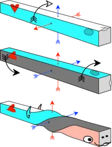 The handedness in both chirality and helicity relate to the rotation of a particle while it proceeds in linear motion with reference to the human hands. The thumb of the hand points towards the direction of linear motion whilst the fingers curl into the palm, representing the direction of rotation of the particle (i.e. clockwise and counterclockwise). Depending on the linear and rotational motion, the particle can either be defined by left-handedness or right-handedness.[5] A symmetry transformation between the two is called parity. Invariance under parity by a Dirac fermion is called chiral symmetry.