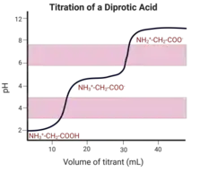 A diprotic acid donates two protons and a diprotic base accepts two protons. The titration curve for a diprotic solution has two equivalence points.[13][9]