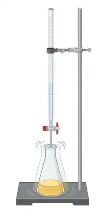The standard solution (titrant) is stored in the burette, while the solution of unknown concentration (analyte/titrate) is placed in the Erlenmeyer flask below it with an indicator.[9]