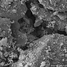 Under an electron microscope, the high surface-area structures of activated carbon are revealed. Individual particles are intensely convoluted and display various kinds of porosity; there may be many areas where flat surfaces of graphite-like material run parallel to each other,[2] separated by only a few nanometres or so. These micropores provide superb conditions for adsorption to occur, since adsorbing material can interact with many surfaces simultaneously. Tests of adsorption behaviour are usually done with nitrogen gas at 77 K under high vacuum, but in everyday terms activated carbon is perfectly capable of producing the equivalent, by adsorption from its environment, liquid water from steam at 100 °C (212 °F) and a pressure of 1/10,000 of an atmosphere.